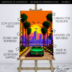 Ce tableau de Los Angeles vintage est une représentation vibrante de la ville animée, avec des tons chauds reflétant la lumière dorée du soleil californien. Les gratte-ciel s'élèvent sur la ligne d'horizon dans ce style pixelisé.