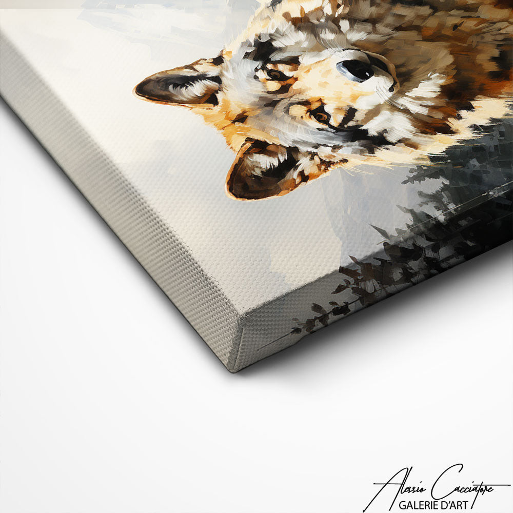 Ce tableau loup en montagne au style artistique unique présente une vision originale de cet animal emblématique. Cette œuvre d'art ajoutera une touche de magie et d'évasion à votre intérieur.