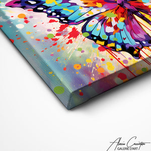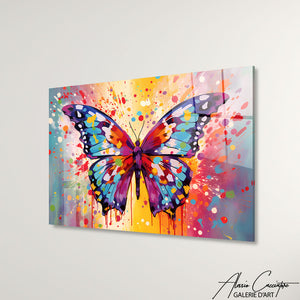Les couleurs apportées par l'artiste sur le papillon ainsi que dans le fond premettent de créer une atmosphère féerique pour ce tableau lumineux de papillon