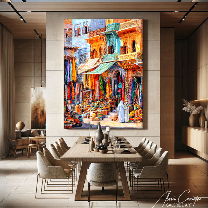 Notre tableau marocain moderne mêle l'art traditionnel à une touche contemporaine, avec des motifs géométriques inspirés de l’architecture orientale. Les couleurs riches et les formes raffinées évoquent l’âme du Maroc, offrant à votre intérieur une décoration à la fois authentique et élégante.