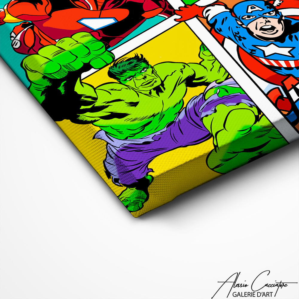 L'artiste rend hommage aux icônes de la culture marvel, les mettant en relief avec des couleurs vives et un design audacieux. Ce tableau marvel est une célébration de la culture populaire.