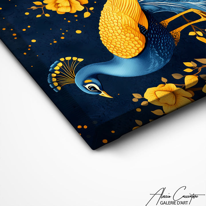 L'intensité azurée du plumage se déploie majestueusement dans notre tableau saisissant du paon bleu. Les nuances cobalt, turquoise et saphir s'entremêlent pour recréer la magie visuelle de cet oiseau emblématique. Une pièce décorative qui apporte profondeur et mystère à votre espace avec sa présence chromatique envoûtante.
