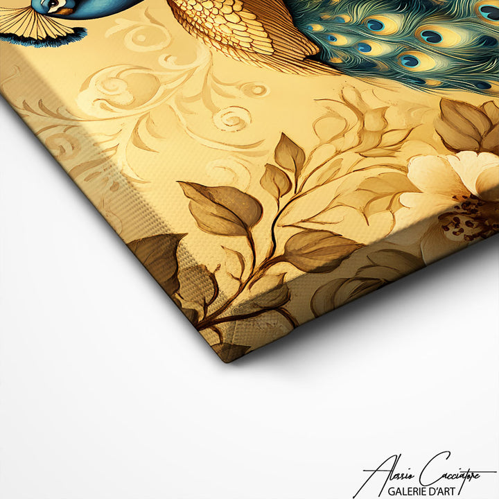 Le style précieux et la couleur dorée subliment cette notre tableau luxueux du paon. Ce tableau capture la lumière et crée un effet somptueux qui évoque richesse et opulence. Un tableau qui transforme votre intérieur avec son aura précieuse et sa présence royale, parfait pour les décors recherchant une touche d'exception.