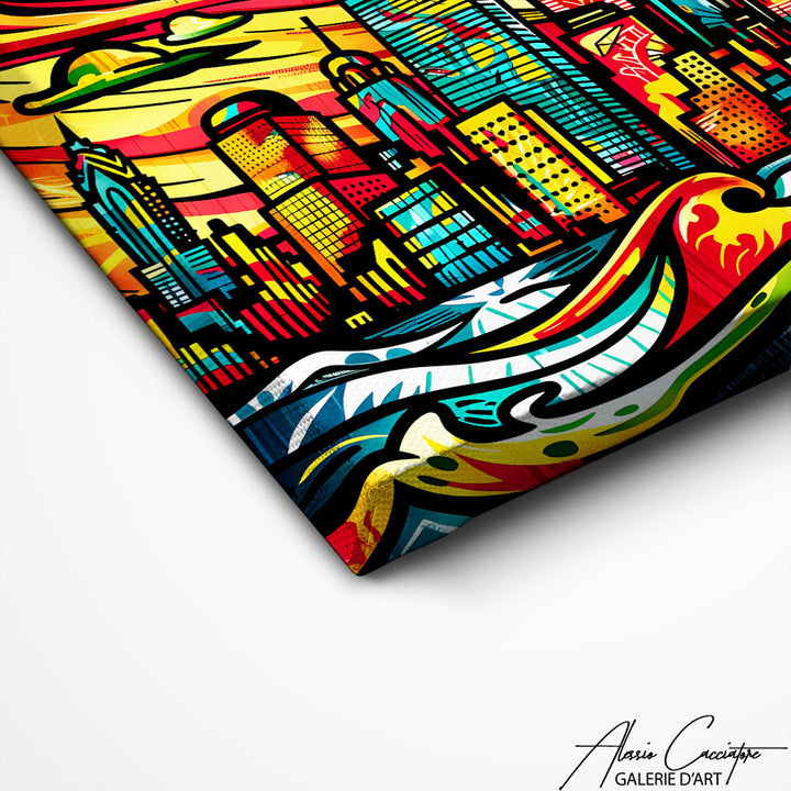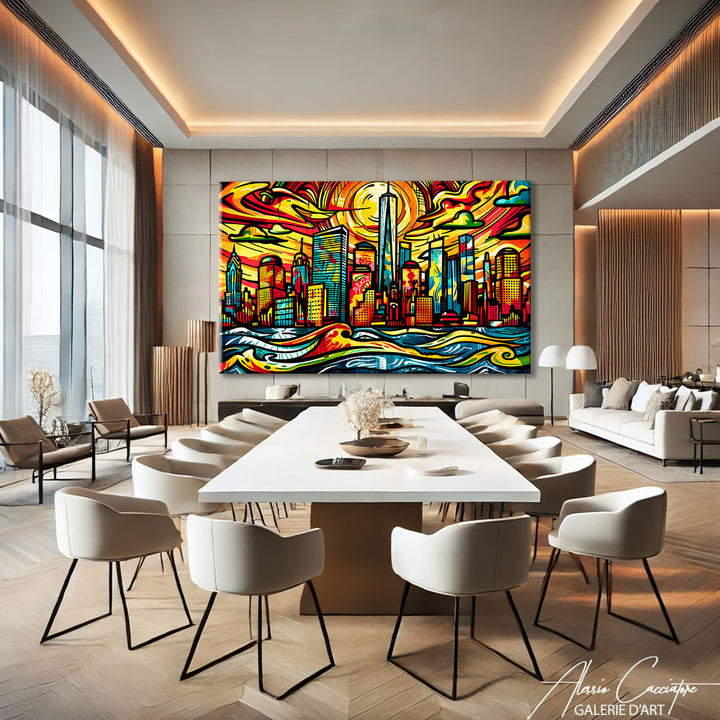 Notre tableau moderne New York revisite la ville avec un style artistique audacieux, mêlant abstrait et réalisme. Ses contrastes de couleurs et son jeu d'intensité en font une pièce captivante, parfaite pour un intérieur contemporain.