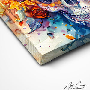 Ce tableau tête de mort décoré de fleurs allie le symbolisme macabre à la douceur de la nature, créant une œuvre à la fois poétique et contrastée. Les couleurs vives des fleurs apportent une touche de vie à cet emblème de la mortalité.