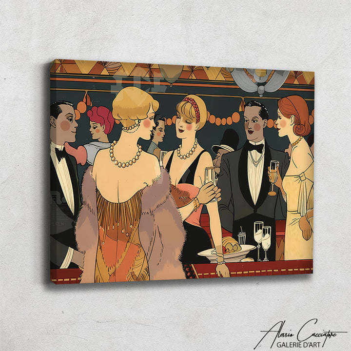 Notre tableau Art Déco vintage capture l’effervescence et le glamour des soirées des années 1920. Dans une ambiance festive, des silhouettes élégantes, habillées de smokings et de robes scintillantes, trinquent et dansent sous la lueur tamisée d’un décor luxueux. Les lignes géométriques raffinées et les contrastes subtils ajoutent une touche sophistiquée, parfaite pour un intérieur chic et intemporel.